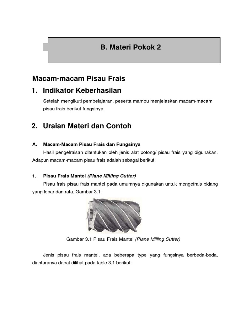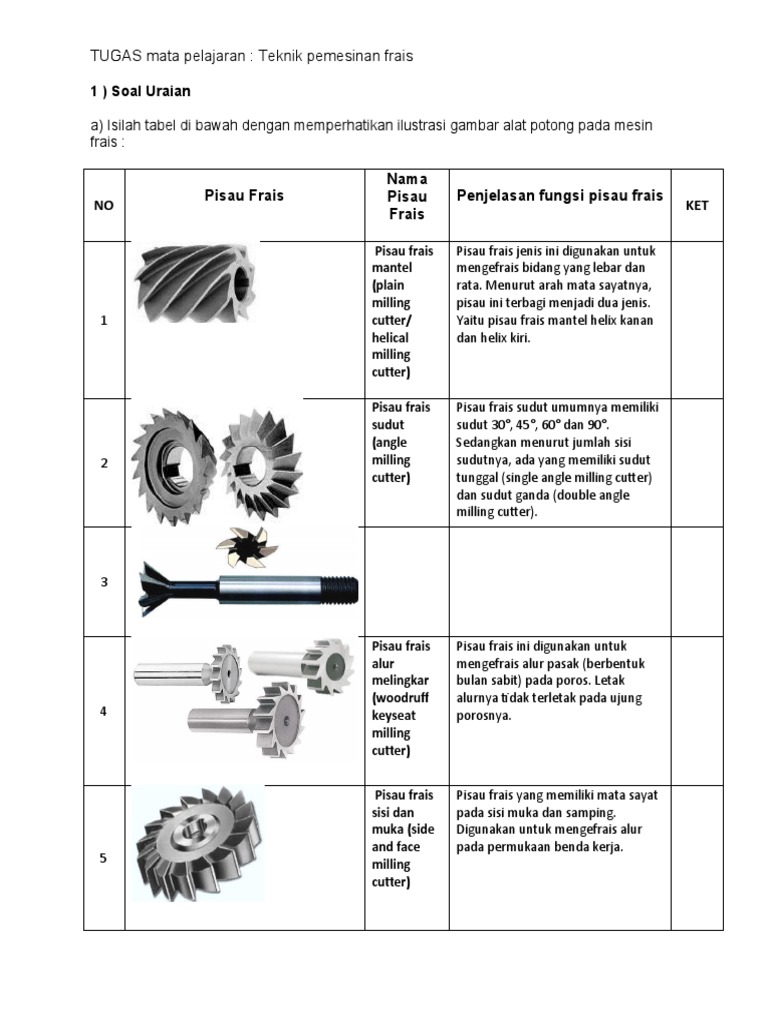 Pisau jenis ini digunakan untuk. Cutter Mantel Cutter jenis ini digunakan untuk mesin frais horizontal dengan mata pisau yang miring panjang dan banyak. Ada bermacam-macam pisau frais yang umum dipakai untuk pengefraisan.